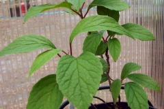 Stems are brown, reach 10 m (1 m of new growth a year) and can either twine round the support or spread along the ground. Leaves are alternately arranged, tough, glossy, dark green leaves, 7 – 8 cm long and elliptically shaped. In autumn the leaves change color to yellow. Leaves are fragrant.