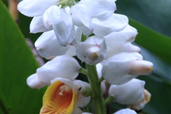 The inflorescences are the showiest parts of the plant. They are held erect at the tip of the stem, bearing among the largest of the Alpinia flowers. Flowers are borne in erect racemes, up to 35 cm; axis stout, densely yellow velvet-hairy; bracteoles white, broadly elliptic, 3.5–4 cm. Flower-stalk is about 7 mm, densely yellow velvet-hairy. Calyx is bell-shaped, about 1.5 cm, densely silky. Flowers are white, silky; tube about 1 cm; lobes oblong-lanceshaped, 2.5–3 cm. Lateral staminodes are absent. Lip is yellow with red stripes, ovate, about 3.5 cm, tip notched. Stamen is about 2.4 cm long. Ovary is hairy.