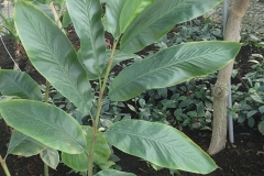 The plant has large glossy green leaves arranged in 2 rows on the upper half of the stem. Leaves are oblong-lance or lance shaped, up to 60-90 cm long and 10-15 cm wide and abaxially pubescent; below velvet-hairy, base pointed and tip tapering. Petiole is 2 cm and is grooved.
