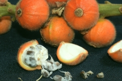Fertile flowers are followed by capsule that is almost spherical about 2 cm in diam., with slight depressions at each end. They are covered with fine hairs and turn orange when ripe. If crushed, the fruits emit a smell like the leaves of Piper sarmentosum, a culinary spice and salad, known in Malaysia as ‘daun kadok’.