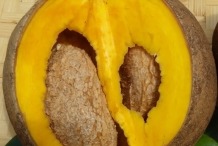 Mammee Apple is round or somewhat irregular fruit, with a short, thick stem, 10–20 cm across, greyish brown with a rugose, 3 mm (0.12 in) thick, leathery rind. It is actually a berry not a drupe which is 0.5-2 kg. Fruit is normally green while young turning to yellow or russet as soon as they ripe. Fruit has light brown or greyish-brown with small, scattered, warty or scurfy areas, leathery, about 3 mm thick and bitter skin, which encloses light yellow or orange, not fibrous mammee apple which smells pleasant and appetizing. Fruits normally take up to a year to mature and are ripe from July-February. Fruits consists of 1-4 brown, rough, oval and around 6 cm (2.4 in) long seeds. It has flavor which resembles like that of apricot or red raspberry and is too sour or mawkishly sweet in taste. Due to its unique taste and flavor it is found used in different types of foods items around the world.