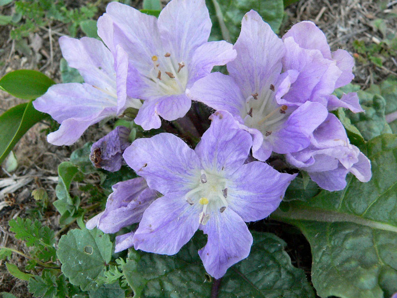 The flowers appear from autumn to spring (September to April). They are borne in the axils of the leaves. The flower stalks (pedicels) are also very variable in length, up to 45 cm (18 in) long. The five sepals are 6–28 mm (0.2–1.1 in) long, fused together at the base and then forming free lobes to about a half to two-thirds of their total length. The five petals are greenish white to pale blue or violet in color, 12–65 mm (0.5–2.6 in) long, and, like the sepals, joined together at the base with free lobes at the end. The lobes are between half as long as the petals to almost as long. The five stamens are joined to the bases of the petals and vary in length from 7 to 15 mm (0.3 to 0.6 in). The anthers of the stamens are usually yellow or brown, but are sometimes pale blue.