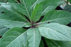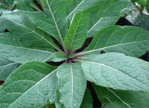 The plant almost has no stem. Immediately from the crown of the root arise several large, dark-green leaves, which at first stand erect, but when grown to full size a foot or more in length and 4-5 inches in width – spread open and lie upon the ground. The leaves are very variable in size and shape, with a maximum length of 45 cm (18 in). They are usually either elliptical in shape or wider towards the end (obovate), with varying degrees of hairiness. They are sharp pointed at the apex and of an unpleasant odor.