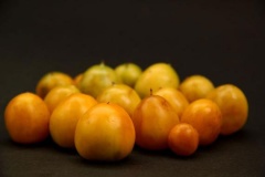 The fruit which forms in late autumn to early summer (November to June) is a small berry, shaped like a globe or an ellipsoid (i.e. longer than wide), with a very variable diameter of 5–40 mm (0.2–1.6 in). When ripe, the fruit is glossy, and yellow to orange, full of pulp and with a strong, apple-like scent – somewhat resembling a small tomato. It contains yellow to light brown seeds, 2.5–6 mm (0.10–0.24 in) long.
