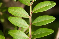 The leaves are persistent, leathery, hairless, and composed of 2-7 pairs of leaflets (even-pinnate), unlike its relative, the Mount Atlas mastic (Pistacia altantica), which has an uneven number of deciduous leaflets. They are 1.5-3 cm long. The leaves are arranged alternately on the branches, while the leaflets are more or less opposite along the leaf stalk, which often has small lateral wing-like expansions. The leaflets also have an entire margin, are elliptical or lanceolate, shiny, dark on the upper side, somewhat lighter on the underside and, often, terminate in a soft tip. The leaves are often damaged by round galls that protrude from the leaf surface. The leaf axis is flat and winged.