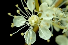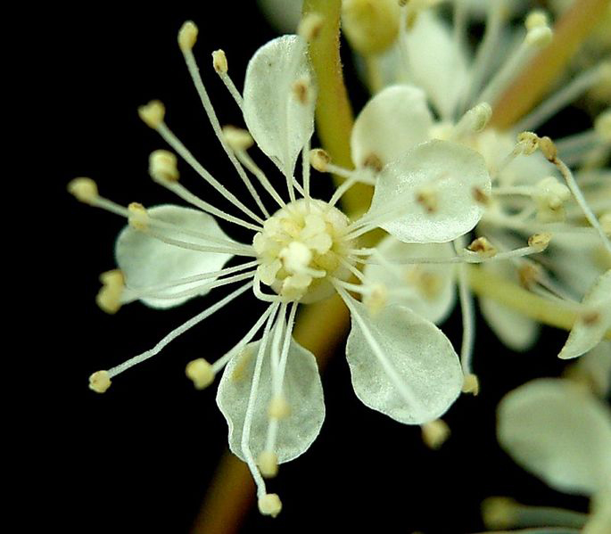 Radial flowers form in terminal compound. Cymes are loose arranged with irregular and erect branches. Sepals are up to 5 or 6, pointed, triangular and 1 mm long. Petals are narrowed to short stem, obviate, color ranges to yellowish white about 2-5 mm long. It has glabrous or downy ovaries with flattened stigma bearing style of about 1 mm.