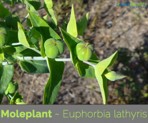 Mole plant is a glabrous to glaucous succulent annual, biennial, perhaps perennial plant that grows about 1.5 m tall with a glaucous blue-green stem. The plant is common and persistent in gardens, waste places, cultivated land, riverbeds, coastal situations, grasslands, marshes, dunes, scrub and chaparral habitats. Leaves are lance shaped, arranged in decussate opposite pairs, and are lanceolate, 5–15 cm long and 1-2.5 cm broad, glaucous blue-green with a waxy texture and pale greenish-white midrib and veins. The flowers are green to yellow-green, 4 mm in diameter, with no petals. Flowering normally takes place from May to June. Fertilize flowers are followed by 3-lobed, sub globose capsule which are coarsely wrinkled and 1/2 to 1 cm long. Fruits are initially green ripening to brown or Grey. Seeds are ovoid, flattened, 4–6 mm long, carunculate and hard. Unfortunately, all parts of mole spurge plant are poisonous. Despite its poisonousness, various parts of the mole spurge plant have been used medicinally through the years.