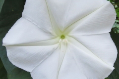 The large trumpet-shaped flowers have a very long and narrow greenish-white floral tube that is 7- 15 cm long and five large white spreading lobes (10-15 cm wide). They are borne in several-flowered clusters, or occasionally singly, in the leaf forks. These flowers open at night, hence the common name “moonflower”, and usually wither by early the next morning. They have five small sepals that are 5-20 mm long with pointed tips and are borne on 7-15 mm long stalks. Each flower has five whitish-coloured stamens and a style that are exerted from the end of the floral tube. The flowers also tend to remain open longer during cool temperatures – which may also cause the segments to snag or tear as they open. Flowering occurs during summer and autumn.