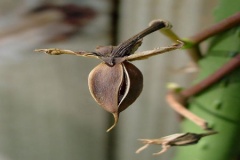 Fertile flowers are followed by a small capsule that is 2-3 cm long with a pointed tip. As the fruit matures the flower stalk becomes enlarged, and when fully mature the fruit turns from green to dark brown or blackish in color. It then splits open to release four large, hairless, whitish-coloured seeds that are about 10 mm long.