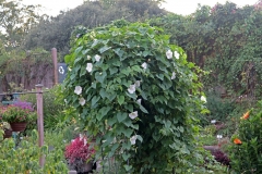 The Mesoamerican civilizations used the Ipomoea Alba morning glory to convert the latex from the Castilla elastica tree to produce bouncing rubber balls. The sulfur in this morning glory served to cross-link the rubber, a process predating Charles Goodyear’s discovery of vulcanization by at least 3,000 years. Moon Vine is native to American tropics, but has naturalized in many places where it was introduced.
