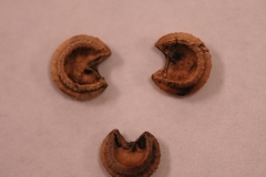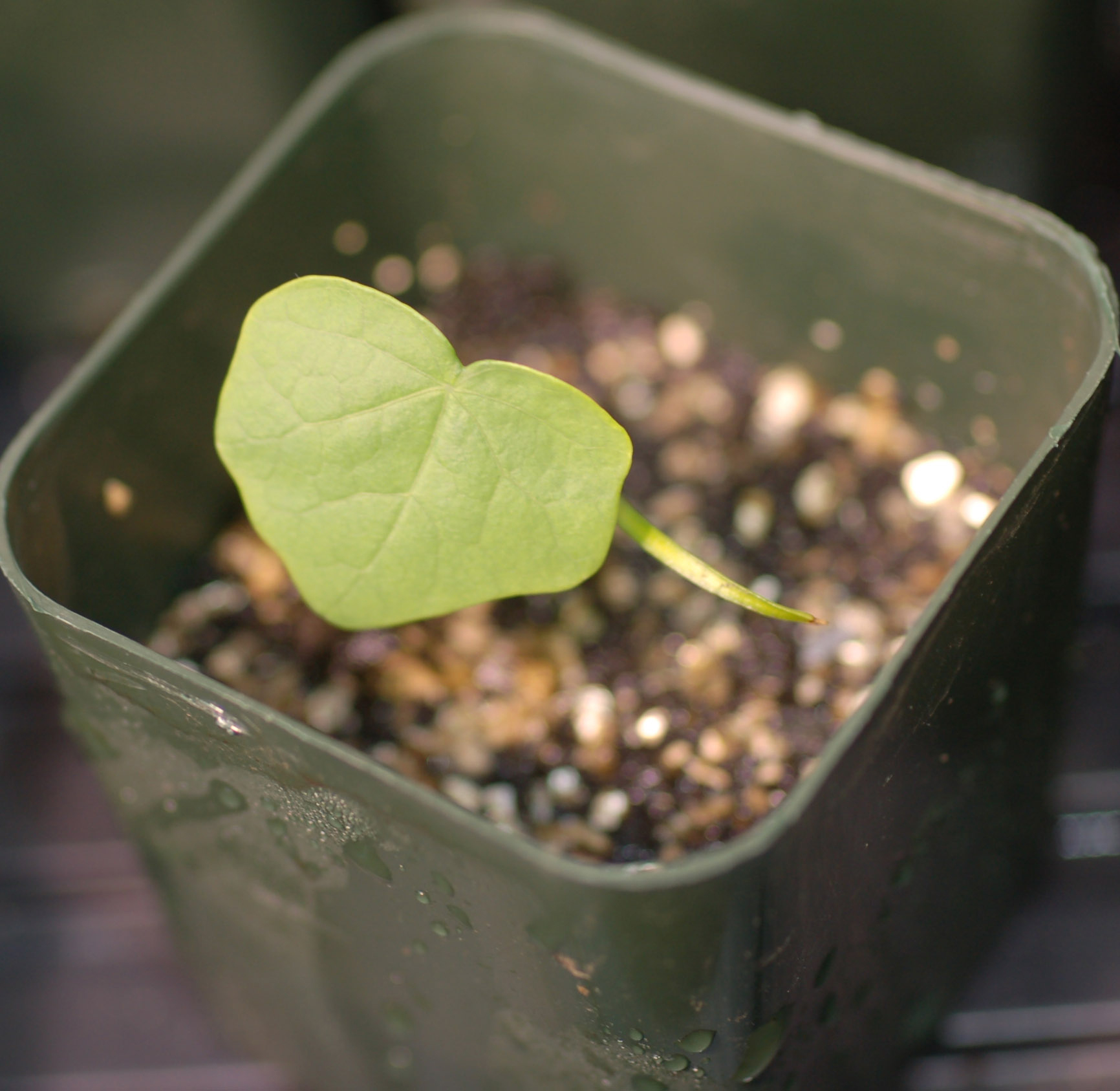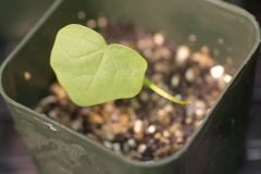 Seed are crescent moon about 6-10 mm across, light tan to brown to gray. Seedlings are long thin cotyledons but typically shaped first true leaf.