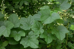 Leaves are alternate measuring 3 to 8 inches long and heart shaped at the base with 7 to 12 primary veins radiating from the base. The edges of leaf are toothless and have 3 to 7 shallow lobes. The lobe tips are rounded to bluntly pointed. Upper surface is medium to dark green, hairless or becoming hairless. Lower surface is paler, finely hairy especially along the veins. Leaf stalks are 8 inches long and attached on underside near but not at the base of the leaf.