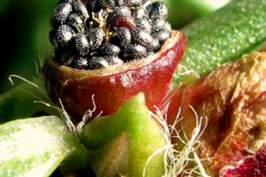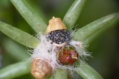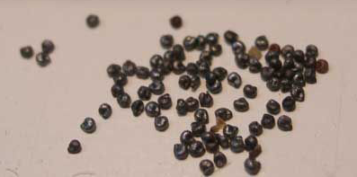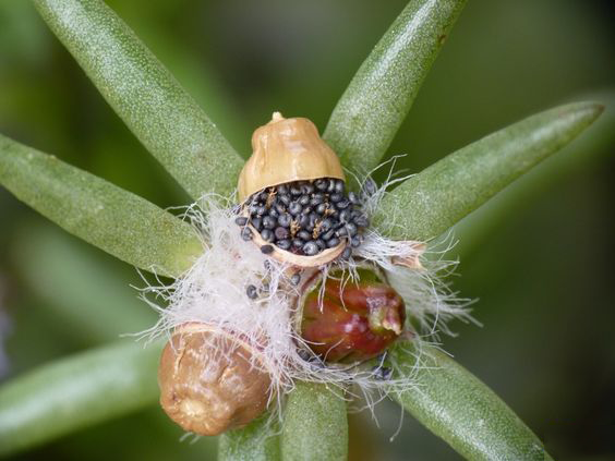 Fertile flowers are followed by a globose-ovoid shaped dehiscent capsule. It is surmounted by two sepals. The dehiscence line is located at the equator of the capsule. It is 6 to 8 mm long and contains many seeds. The seeds are reniform-globose, laterally compressed, with a diameter of 0.75-1 mm. They are steely grey to black, sometimes iridescent or some-what glossy. The tegument is marked with spiny tubers.