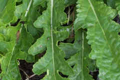 Leaves have prominent veins, irregularly toothed edges, lack hairs and are dark green. Rosette leaves are deeply toothed, oblong, and narrow at the base and attached to the compressed stem of rosette by way of short petioles and measures 8 inches long. Leaves on flowering stem are alternate resembling rosette leaves, shallow toothed and have sharply pointed tips. Stem leaves lack petioles and are triangular with broad bases which clasp the stem.