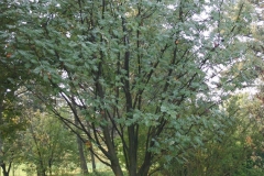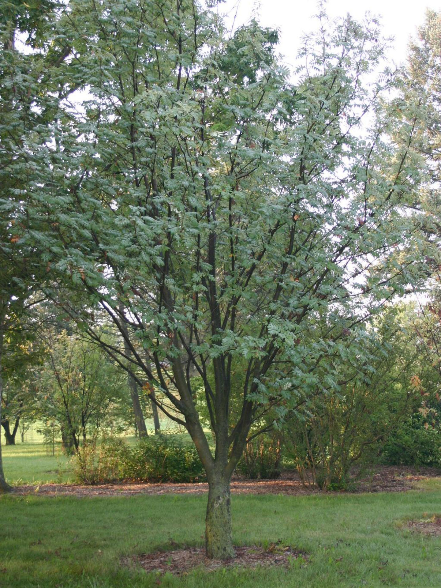 Mountain ash (Rowan-berry) is an upright, medium-sized, slender, short-lived deciduous tree that normally grows about 7 ½ to 12 m tall with a rounded, open crown. The crown is loose and roundish or irregularly shaped but wide and the plant often grows multiple trunks. Trunk is slender and cylindrical and reaches up to 40 cm in diameter, and the branches stick out and are slanted upwards. The bark of a young S. aucuparia is yellowish gray and gleaming and becomes gray-black with lengthwise cracks in advanced age; it descales in small flakes. Lenticels in the bark are elongated and colored a bright ocher. The plant does not often grow older than 80 years and is one of the shortest-lived trees in temperate climate. Wood of S. aucuparia has wide reddish white sapwood and a light brown to reddish brown heartwood. It is diffuse-porous, flexible, elastic, and tough, but not durable, with a density of 600 to 700 kg/m3 in a dried state. The roots grow wide and deep, and the plant is capable of root sprouting and can regenerate after coppicing.