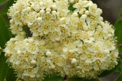 Mountain ash (Rowan-berry) is monoecious. It reaches maturity at age 10 and carries ample fruit almost every year. The plant flowers from May to June (on occasion again in September) in many yellowish white corymbs that consists of about 250 flowers. The corymbs are large, upright, and bulging. The flowers are between 8 and 10 mm in diameter and have five small, yellowish green and triangular sepals that are covered in hairs or bare. The five round or oval petals are yellowish white and the flower has up to 25 stamens fused with the corolla to form a hypanthium and an ovary with two to five styles; the style is fused with the receptacle. Flowers have an unpleasant trimethylamine smell. Their nectar is high in fructose and glucose.
