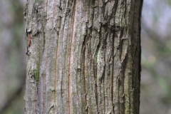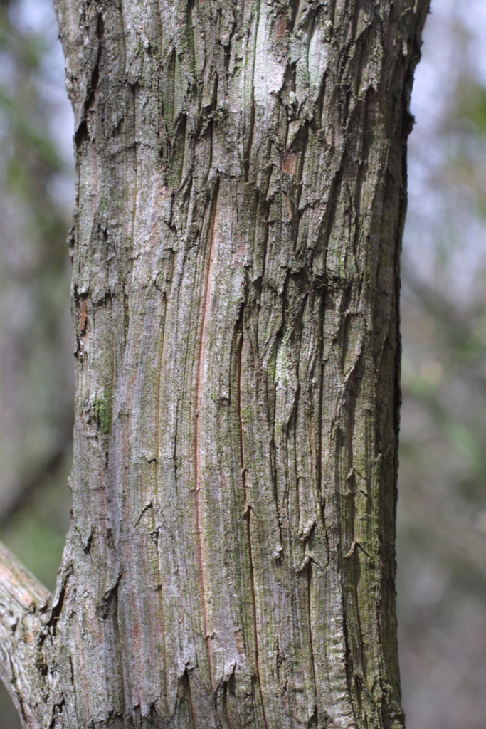 Bark is thin and dark brown, shredding and splitting on old stems.
