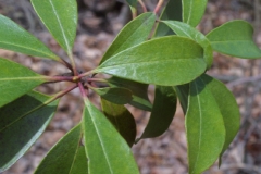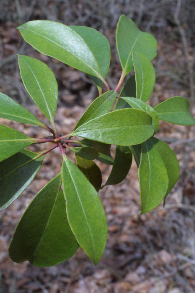 Leaves are alternate, simple, elliptical and 2 to 5 inches long with entire margin, pointed tip and mid-vein raised on upper surfaces, shiny/waxy green above, yellow green below.