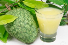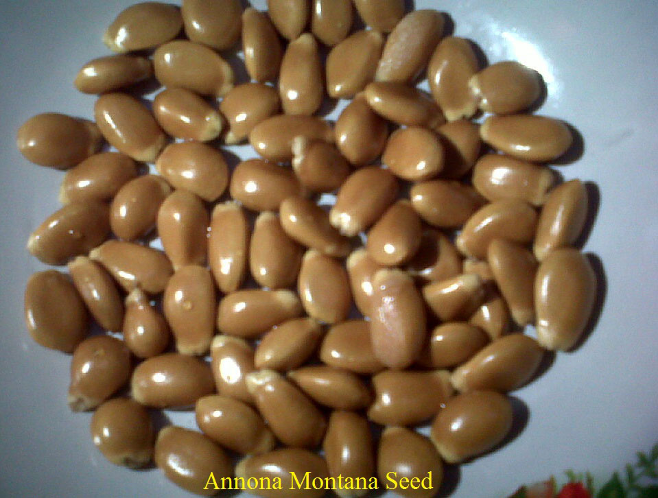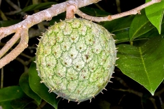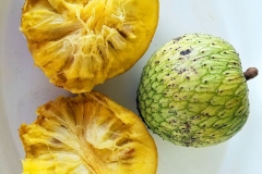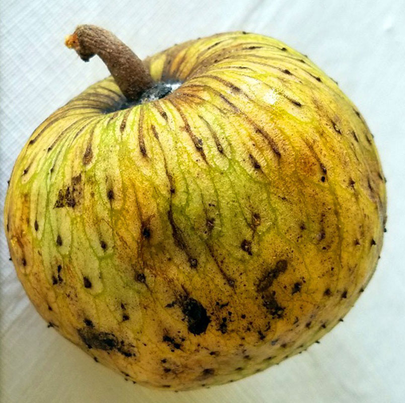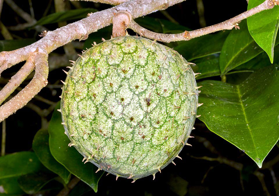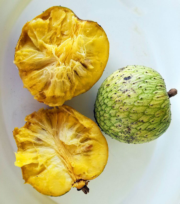 Fruits are nearly round or broad-ovoid, about 15 cm (5.9 inches) long and 7–13 cm wide. Its dark-green skin is studded with numerous short, fleshy spines and dark brown hairs. Fruits are initially green turning to yellow and very soft when ripe and fall down. Fruits have a yellow, fibrous flesh that is aromatic, sour to bitter, and contains many light-brown, oblong plump seeds about 18 mm long. Fruits are considered inferior to the soursop, so although it is occasionally cultivated, commercial production is not frequent.