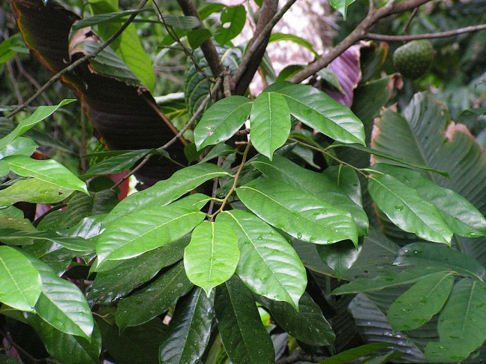 | Leaf | Alternate, distichous, short petiolate, oblong or elliptic 7–18 cm long by 2.5–8 cm wide, with tapering apex and rounded base, leathery, dark green above and pale green beneath, glabrous and glossy |