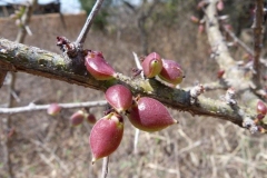 Tiny and inconspicuous, borne in more or less clustered panicles. All Commiphora species are dioecious. Male flowers usually precocious, 3-4 mm long which are often sparsely glandular. Bracteoles are pale brown, ovate-triangular, 0.5–0.7 mm. long and wide, often lightly attached at the base and forming a fragile detachable collar. Receptacle is beaker-shaped, ± 2 mm. deep and 2.3 mm. wide. Calyx-tube is 1 mm. lobes ovate-triangular 1.5 mm. long. Petals are oblong, tapering, pointed and recurved at the tip, 4.5 mm. long and 1.5 mm. wide. Filaments are 1.4 and 1.2 mm, anthers 1.2 and 1.0 mm. long.