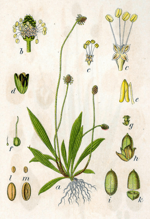 The genus name Plantago, derived from Latin “planta” (= foot sole, foot face) with the common suffix of plants “ago” refers in part to the flat, oval leaves of the plantain (P. major) lying closely on the ground in rosettes, on the other hand that the plantain is formed by being compressed by feet. The long-lanceolate and typical parallel leaves of the plantain are referred to in the epithet lanceolate (from the Latin “lanceolata” = small lance).