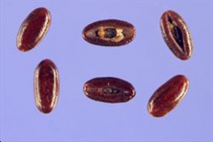 Each flower is replaced by a small seed capsule that is ovoid or oblongoid; it splits cleanly and evenly in the lower half to release 2 small seeds. Fruits are initially green turning to brown as they mature. Each seed is oblongoid, dark brown or black, 2-3 mm long and mucilaginous when wet and strongly depressed on one side. This plant spreads mostly by reseeding itself. The mass of 1000 seeds is 1-1.5 g.