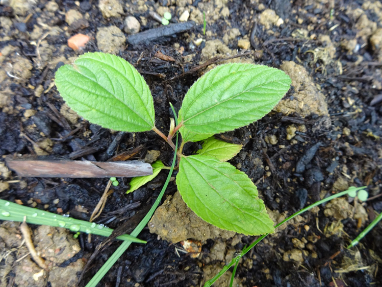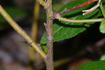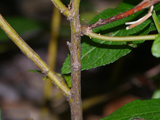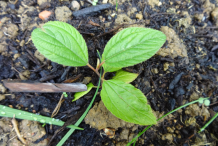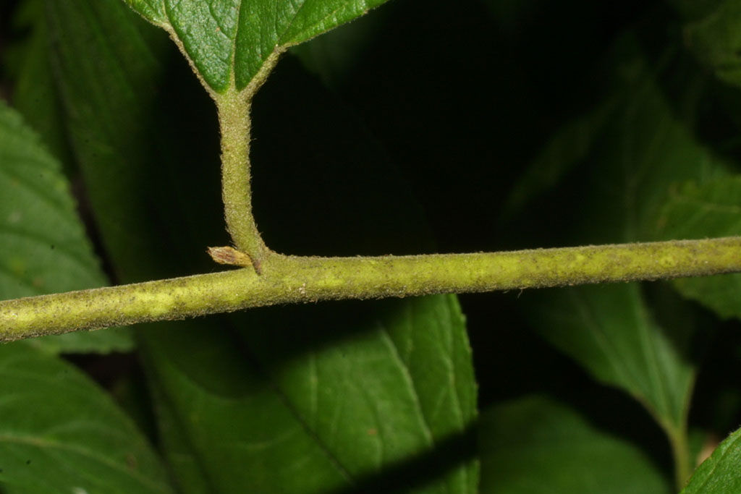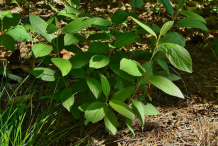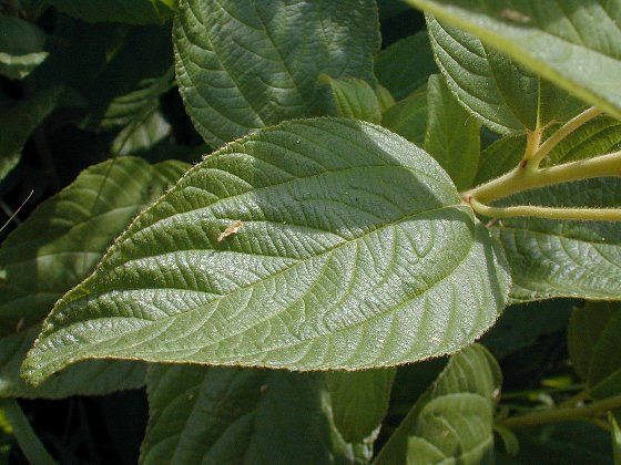 Leaves are alternate or opposite; about 3 inches long and 2 inches across; they are ovate in shape and their margins are smooth to finely serrated and slightly ciliate. The upper leaf surface is pale-medium to dark green, and smooth to somewhat rough from minute stiff hairs. The lower leaf surface is pale green and pubescent or hairy; hairs are typically more abundant along the lower sides of the veins. The central vein and two primary lateral veins are palmate, while the remaining veins are pinnate; the upper leaf surface is often wrinkled along these veins.