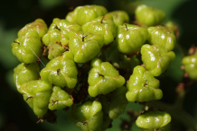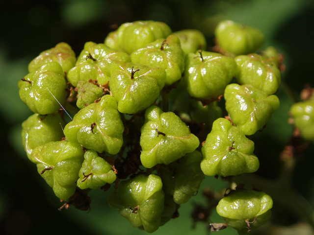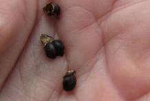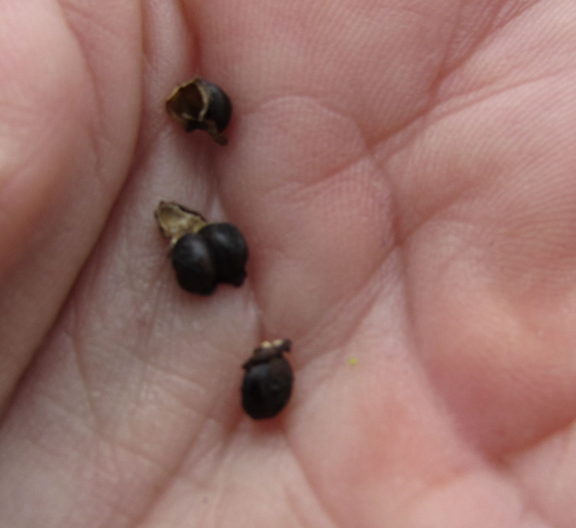 The fruit is a triangular 3-sectioned capsule about ¼ inch across, each section containing 1 seed, depressed on the top, shiny green when young ripening to a dull dark purplish black when mature. Inside each chamber is a yellowish nutlet, each nutlet producing 1 and sometimes two seeds, 2-3 mm. in length, brown to dark brown, glossy, and ovoid in shape flat on one side.