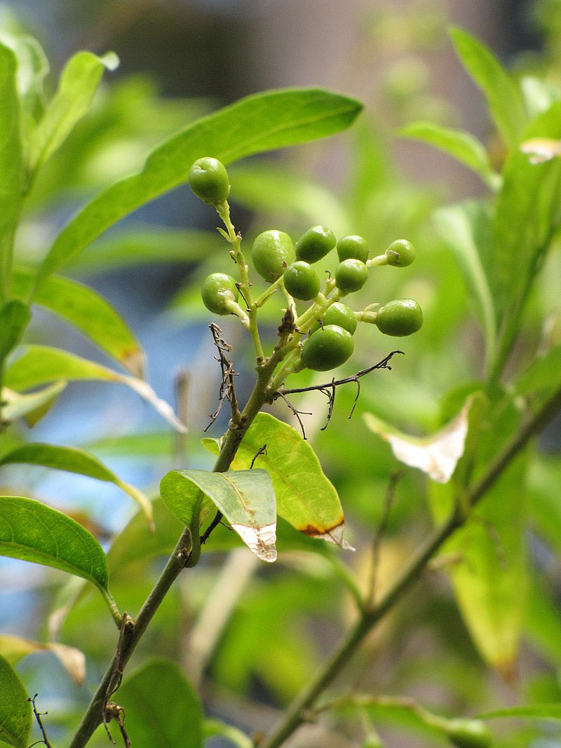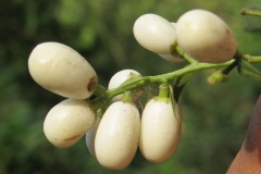 Fertile flowers are followed by small long oval to globular berries, hard or juicy, 8-12 mm in diameter. These berries are initially green turning to white as they mature. The calyx stays fixed to the fruit. There may be up to 10 seeds in a single fruit and each seed is ovoid and about 4-5 mm long and 2-2.5 mm wide and are black colored.