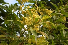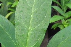 The leaves are long, elliptical and lanceolate (resembling a spear-head), 6-15 cm long and 2-7 cm wide; smooth and glossy with even margins with petioles about 0.4-0.8 cm long. Lateral veins are curving inside the blade margin but not forming definite loops. The mid-rib under surface is finely hairy.