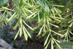 The flowers are produced at the ends of the branches where they occur as dense clusters of flowers on short stems that arise from the junctions of the leaves and the twigs. The result is a densely crowded end cluster of both flowers and leaves. The flowers are tubular, greenish white to cream (there is a known yellow variety) and the top of the tube splits into five sharply pointed, triangular lobes or petals. Tubular section of the flower is 2-2.5 cm long and the opened flower at night is about 1-1.3 cm in diameter. The stamens and anthers are contained within the floral tube.