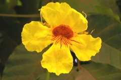 | Flower | Flower buds yellow-green and furry, splitting down 1 side as flower emerges. Flowers bright yellow, in showy terminal clusters, each trumpet shaped, to 6 cm long, with 5 frilly lobes, the throat striped with orange-red |