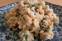 It is used in unohana, a side dish in Japan which comprises of okara cooked with sliced carrots, mirin, soy sauce, shiitake mushrooms and burdock root.