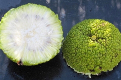 Fertile flowers are followed by a large, yellow-green orange, about 10 to 13 centimeters (4–5 in) in diameter, with a roughened and tuberculated surface. The compound fruit is a syncarp of numerous small drupes, in which the carpels (ovaries) have grown together; thus, it is classified a multiple-accessory fruit. Each small drupe is oblong, compressed and rounded; they consist of milky latex which oozes when the fruit is damaged or cut. Young green-colored fruit ripen and mature to a yellowish-colored mature fruit with a rubbery, bumpy rind. The rind is composed of exterior ends of individual seed sacks. Fruits average 450 grams (g) in weight, but range from 150 to 700g. The individual oval shaped seeds are imbedded in the fleshy calyx and are 8 to 12 millimeters (mm) long. Cleaned seed weight averaged 30,900/kg with a range of 15,400 to 35,300/kg. The seeds are initially cream colored, but turn brown with age and exposure to air.