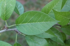 Leaves are deciduous, simple, and alternate or clustered at the ends of short spur-like twigs. Their shape ranges from broad-ovate to ovate lanceolate, rounded or sub-cordate at the base to broadly cuneate or acuminate at the apex. Leaves are 8 to 13 centimeters (3–5 in) with a long tapering and pointed tip and 5 to 8 centimeters (2–3 in) wide with a rounded leaf base and have entire margins. The plant has a 1.5 inch long, milky-sap-oozing, slender petiole connecting leaves to twigs. Leaf blades are dark shiny green, smooth and waxy above; paler green with a few hairs beneath. Autumn color is a translucent yellow.