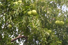 Maclura pomifera commonly known as Osage orange, horse apple or hedge apple tree is a small to medium-sized tree belonging to the Moraceae, or mulberry family. Other cultivated members of this family include the mulberry and fig. The plant is native to river valleys, rich bottomlands and narrow belt in eastern Texas, southeastern Oklahoma, southwestern Arkansas, and the extreme northwest corner of Louisiana, but has been extensively planted in a variety of environments throughout the United States, and has naturalized in many areas, mostly east of the Mississippi River. Some of the popular common names of the plant are hedge, hedge-apple, bodark, bois-d’arc, bowwood, naranjo chino, horse-apple, bow wood, hedge ball, maclura, mock orange, Osage orange, Osage-apple, tennis ball tree, bodock, fence shrub, hedge-orange, postwood, yellowwood, monkey ball and monkey brains.