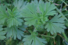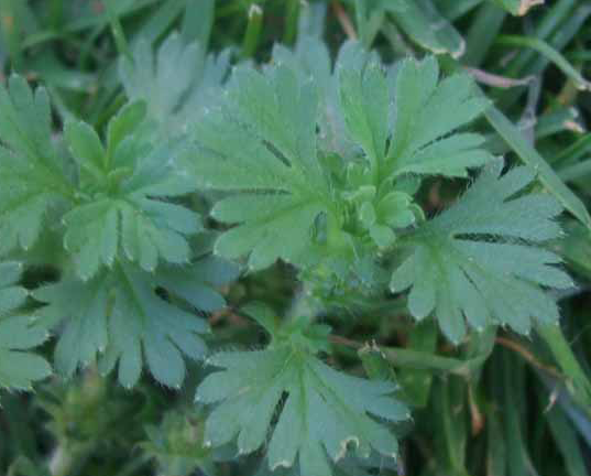 Leaves are dusky green color, wedge-shaped, three-cleft, the lobes deeply cut, the whole leaf less than 1/2 inch wide, narrowed into a short foot-stalk with leafy, palmately-cut stipules, sheathing and cleaving to the footstalk. The whole plant is downy with slender, scattered hairs. Leaves are only 2–10 mm long.