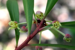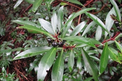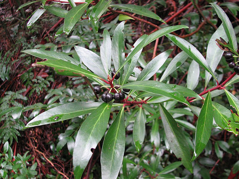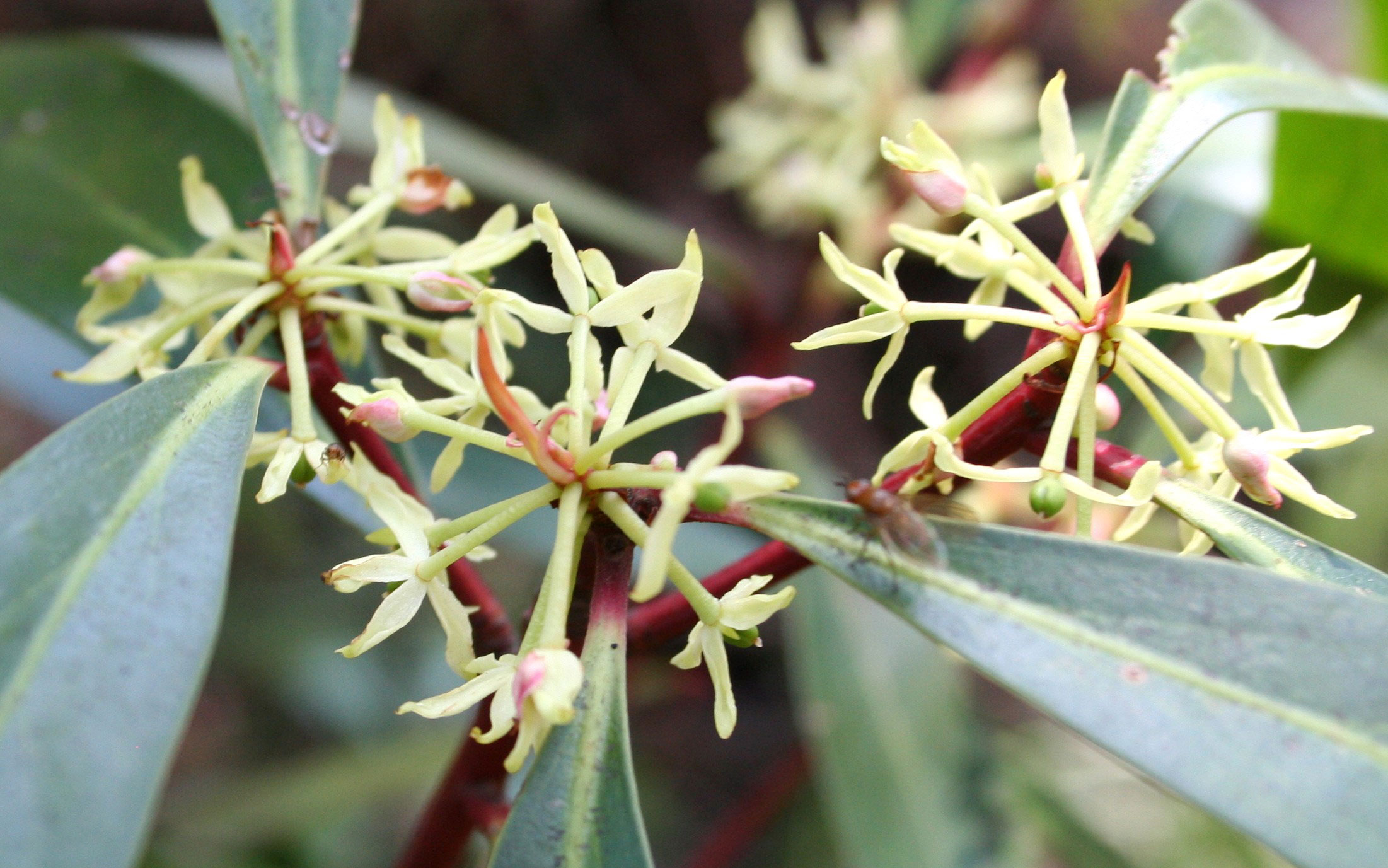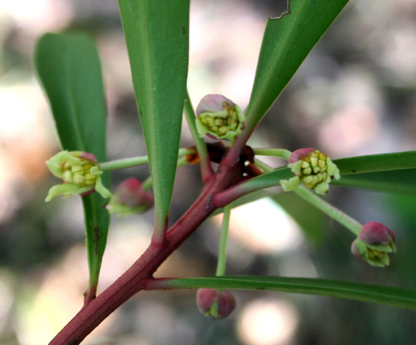 | Leaf | Alternate and borne on 2–4 mm thick, red petioles. Lamina is lanceolate to narrow-elliptic, 4–12 cm long by 0.8–2 cm wide, with acuminate apex, tapering base and entire margin, thick, glabrous, glossy green above and paler green below. Leaves are aromatic when crushed |