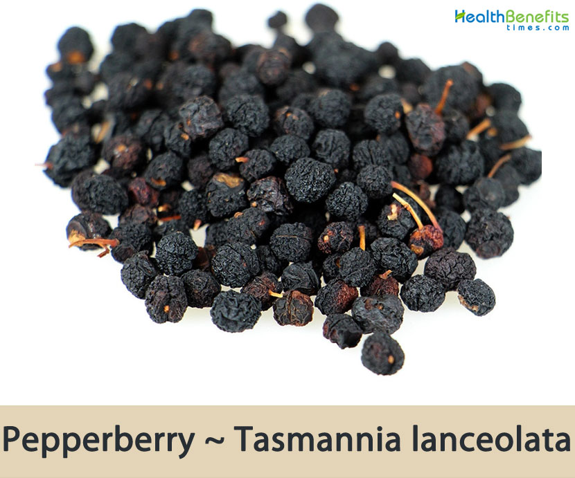 Fertile flowers are followed by black, globose to subglobose two-lobed berry, 5–8 mm across containing numerous, 10–18 small seeds. The fruit starts off dark red in color and turns black on ripening. Only the female trees bear fruit. It has a unique fruity flavor, fragrant eucalypt/ menthol/ fruity aroma, and a characteristically delayed but intense peppery heat. Mountain pepper has a sweet taste and an intense, peppery aftertaste from which they get their name.