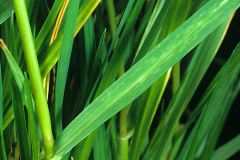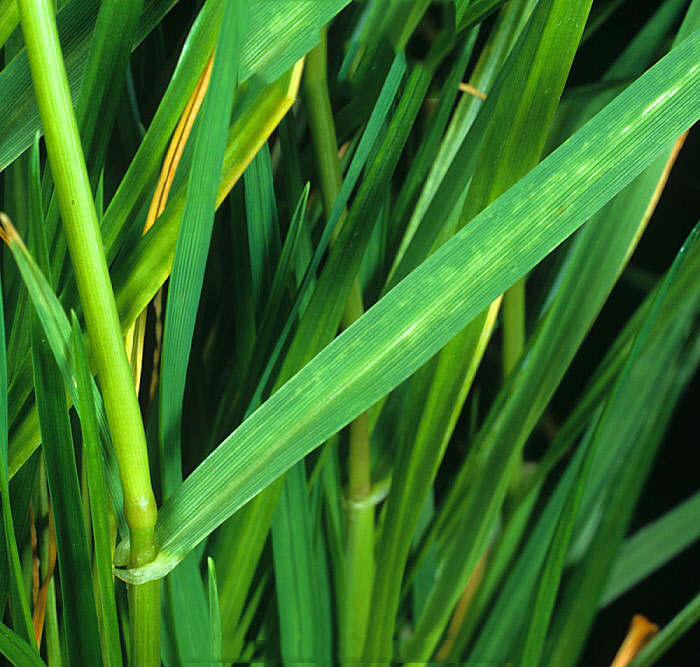 Leaves of perennial ryegrass are folded lengthwise in the bud (in contrast to those of annual ryegrass, which are rolled). Leaf blades are 0.08 to 0.25 inches wide (2 to 6 mm) and 2 to 6 inches long (5 to 15 cm). They are sharply taper-pointed and keeled. Blades are bright green. They are prominently ridged on the upper surface. Lower surfaces are dark green, smooth, glossy, and hairless. Leaf margins are slightly rough to the touch. Blades increase in size from the first to the seventh leaf on a tiller, although tillers rarely have more than three live leaves at one time. Leaf sheaths usually are not keeled. They are compressed but some-times almost cylindrical. Sheaths are hairless, pale green and reddish at the base. They may be closed or split.