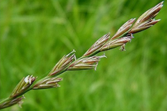 | Flower | Each fertile culm terminates in a flowering spike about 4-10 inches long. This spike consists of several sessile spikelets that alternate along two sides of the rachis (central stalk of the spike). The rachis is slightly indented where each spikelet occurs, providing it with a curvilinear zigzag appearance. Each non-terminal spikelet is 8-16 mm. in length, consisting of a single outer glume at its base and 4-10 lemmas that are arranged in 2 overlapping ranks. The lemmas are 4-7 mm. in length, oblong in shape, convex along their outer surfaces, longitudinally veined, and hairless. The floret of each fertile lemma consists of an ovary, a pair of feathery stigmata, and 3 stamens. The outer glume is longer than individual lemmas, but shorter than the spikelet. Aside from its greater length, the glume is similar in appearance to the lemmas |