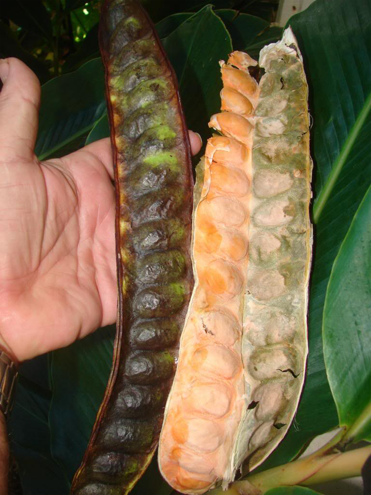 | Pods Shape & Size | Large, 35–55 cm long and 3–5 cm wide, straight or more commonly twisted; hanging in small bundles of 6–10 |