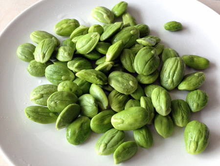 Parkia speciosa commonly known as Petai is actually a erect and evergreen tree native to Malaysia, Brunei, Indonesia, peninsular Thailand and the Philippines (Palawan). Occasionally it is cultivated, but rarely outside its native area. The tree bears long, flat edible beans with bright green seeds the size and shape of plump almonds which have a rather peculiar smell, similar to that of the Shiitake mushroom. It has been used in folk medicine to treat hypertension, diabetes, and kidney problems. They are best when consumed with other strongly flavored foods such as garlic, chili peppers, dried shrimp or shrimp paste.