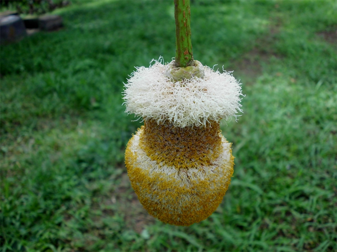 | Flower | Pear-shaped pendulous head, 2-5 cm in diameter; peduncle 20-45 cm long; flowers small and numerous, brown-yellow, male or asexual at the base of the head, bisexual at the apex of the head; calyx and corolla tubular, 5-lobed; stamens (staminodes) 10, filaments at base united into a tube; ovary stipitate |