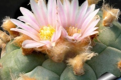 Flowers are solitary, campanulate, pink or white to slightly yellowish, sometimes reddish, up to 1 inch (2.5 cm) long, and up to 0.9 inches (2.2 cm) in diameter. They emerge from the mass of hairs at umbilicate center of crown each surrounded by a mass of long hairs. Stigma-lobes are 5-7, linear and pink. It flowers from March to May, and sometimes as late as September and open during the day. The flowers have thigmotactic anthers (like Opuntia).
