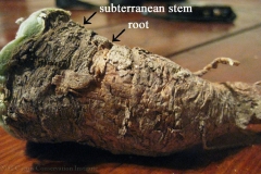 Stem is glaucous green, dull bluish or greyish green, very succulent, globular, top-shaped, or somewhat flattened up to 6 cm tall, 12 cm diameter, with a woolly top. The subterranean portion of the stem, which is as wide as the aerial portion, extends several cm below the surface of the ground and transitions smoothly (through a thin hypocotyl) into a large taproot which may extend over 25 cm below ground level.