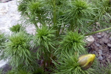 The small fruit forms a globose capitulum. The fruit is tomentose, wrinkled, laterally veined and keeled with a sideways-facing, hook-shaped beak. The fruit are arranged on the spindle-shaped, oblong receptacle. Seeds usually ripen from May to June and are spread by ants. The medicinal part is derived from the aerial parts of the herb, which are collected during the flowering season and dried. The plant is poisonous, containing cardiostimulant compounds, such as adonidin and aconitic acid. In addition, it is often used as an ornamental plant.