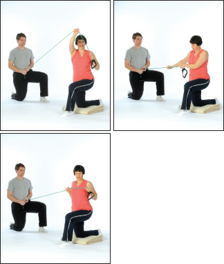 You will be lifting across your body over a trailing knee on the ground. The front knee should be aligned with your hip. Pull the band into your body, then push it up and out with the trailing hand. Keep your spine neutral by concentrating on bracing your stomach and stabilizing the hips. Think about moving around a stable pillar in your spine.