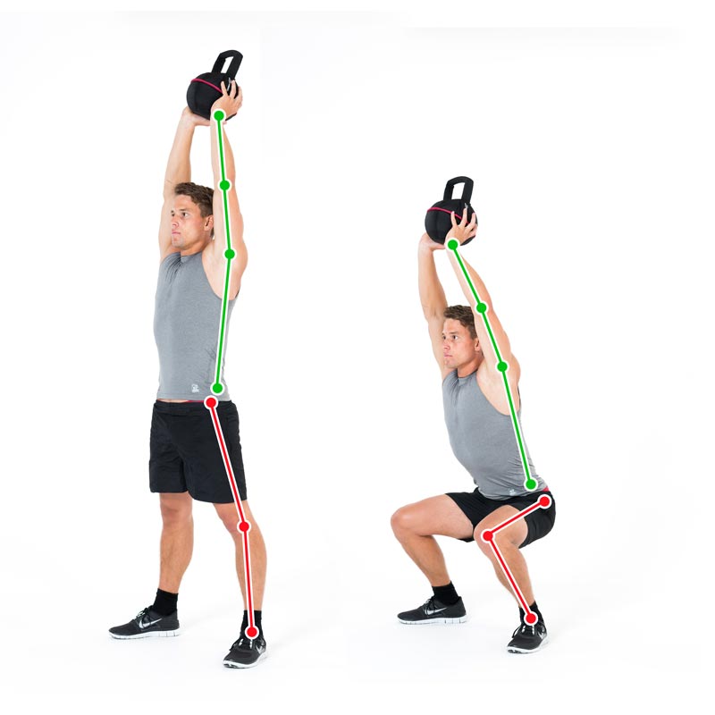 Position yourself with your feet hip-width apart. Point your toes at the 11 and 1 o’clock positions respectively, as this will allow your hips, knees, and ankles to move together properly during the squatting movement. Place a dowel (or broomstick) on the crown of your head so your elbows are at a 90-degree angle, then press the stick above your head. Place a half roller under your heels if you feel your body pitching forward. Drop your hips as low as possible.